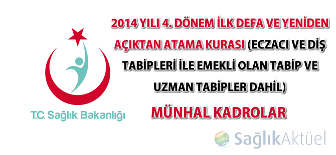 Sağlık Bakanlığı Yönetim Hizmetleri Genel Müdürlüğü tarafından 2014 yılı 4. dönem ilk defa ve yeniden açıktan atama kurası (Eczacı ve diş tabipleri ile emekli olan tabip ve uzman tabipler dahil) münhal kadrolar yayımlandı.