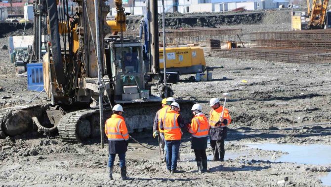 Rize'de deniz dolgusu üzerine yapılacak olan Şehir Hastanesi'nin dolgu çalışmalarında sona gelinirken, zemin iyileştirme çalışmaları sürüyor.