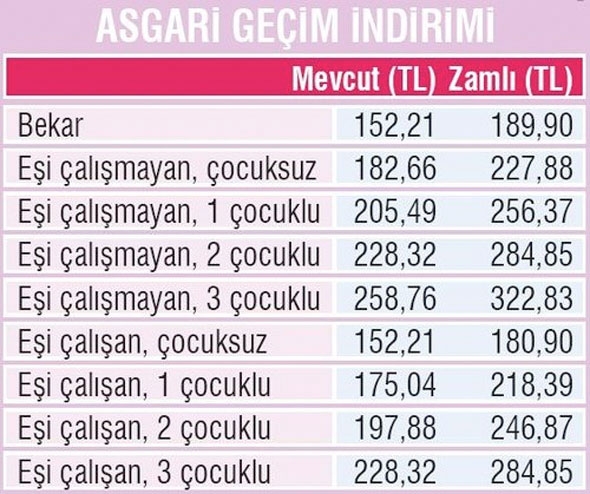 Eşi çalışmayan, 2 çocuklu 284,85 TLEşi çalışmayan, 3 çocuklu 322,83 TLEşi çalışan, çocuksuz 180,90 TL
