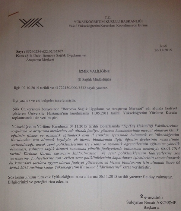 Paralel Yapı'nın finans kaynaklarından olan İzmir'deki Şifa Üniversitesi'ne bağlı 10 hastane, YÖK'ün kararıyla kapatıldı. Polis eşliğinde hastanelere giden İzmir İl Sağlık Müdürlüğü ekipleri, söz konusu kurumların 3 gün içinde kapılacağına dair tebligatı yetkililere bildirdi.