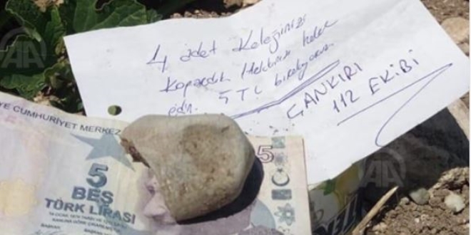 Çelik'in bulduğu notta "4 adet keleğinizi kopardık hakkınızı helal edin. 5 lira bırakıyoruz. Çankırı 112 Ekibi" yazısı yer alıyor.