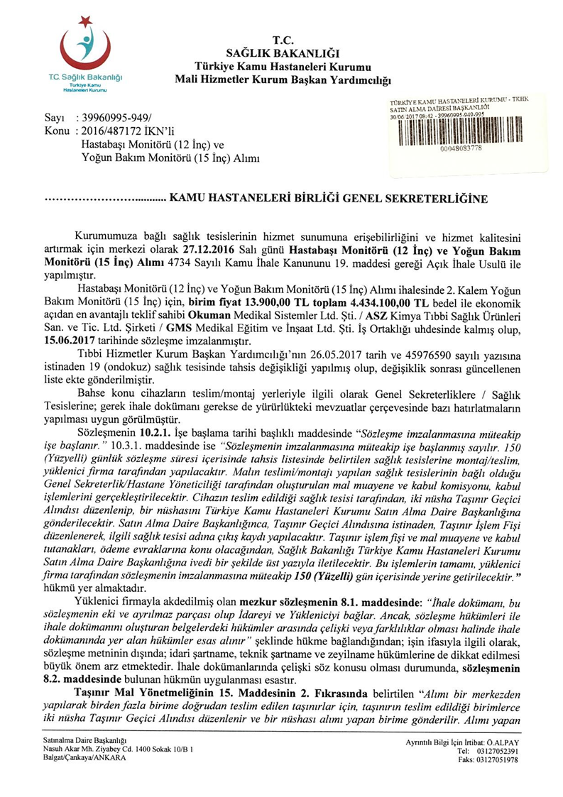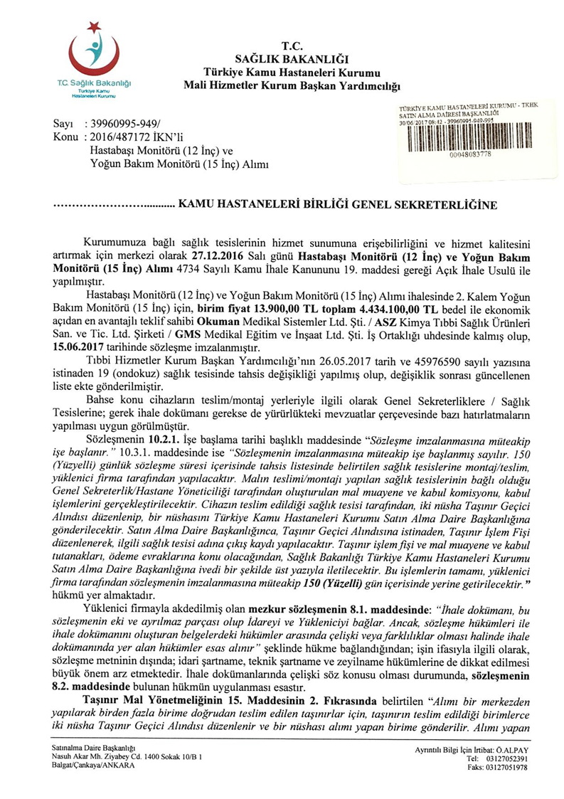 2016/487172 İKN’li Hastabaşı Monitörü (12 İnç) ve Yoğun Bakım Monitörü (15 İnç) Alımı Üst Yazı