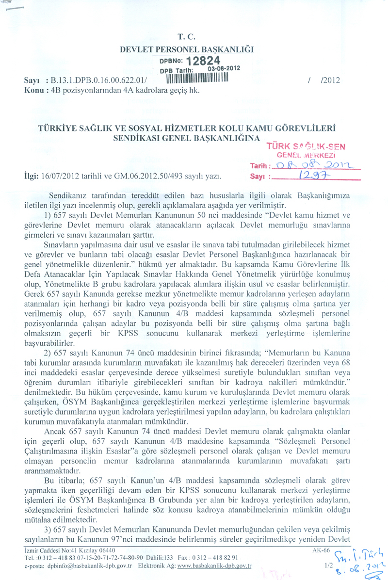 Türk Sağlık Sen tarafından Devlet Personel Başkanlığına KPSS ile 4B'li sözleşmeli personelin 4A'ya geçişi hakkında görüş başvurusu yapıldı. KPSS - 2012/1 Yerleştirme Sonuçlarına göre her hangi bir kurumda kadrolu pozisyonu kazanan ve yerleştirmesi yapılan çalışanların geçiş işlemleri ve bu işlemler sırasında izlenecek usulün netleşmesi adına yapılan başvuru sonucunda Devlet Personel Başkanlığının yazısı 08.08.2012 tarihinde sendikamıza iletildi.