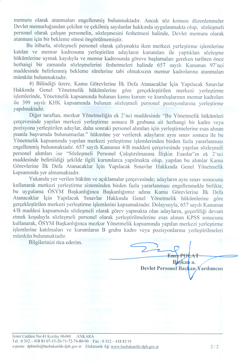 DPB'nın Görüşü: Sözleşmeli pozisyonda çalışanların bu pozisyonda belli bir süre çalışmış olma şartına bağlı olmaksızın KPSS sonucunu kullanarak merkezi yerleştirme işlemlerine başvurabilirler.
