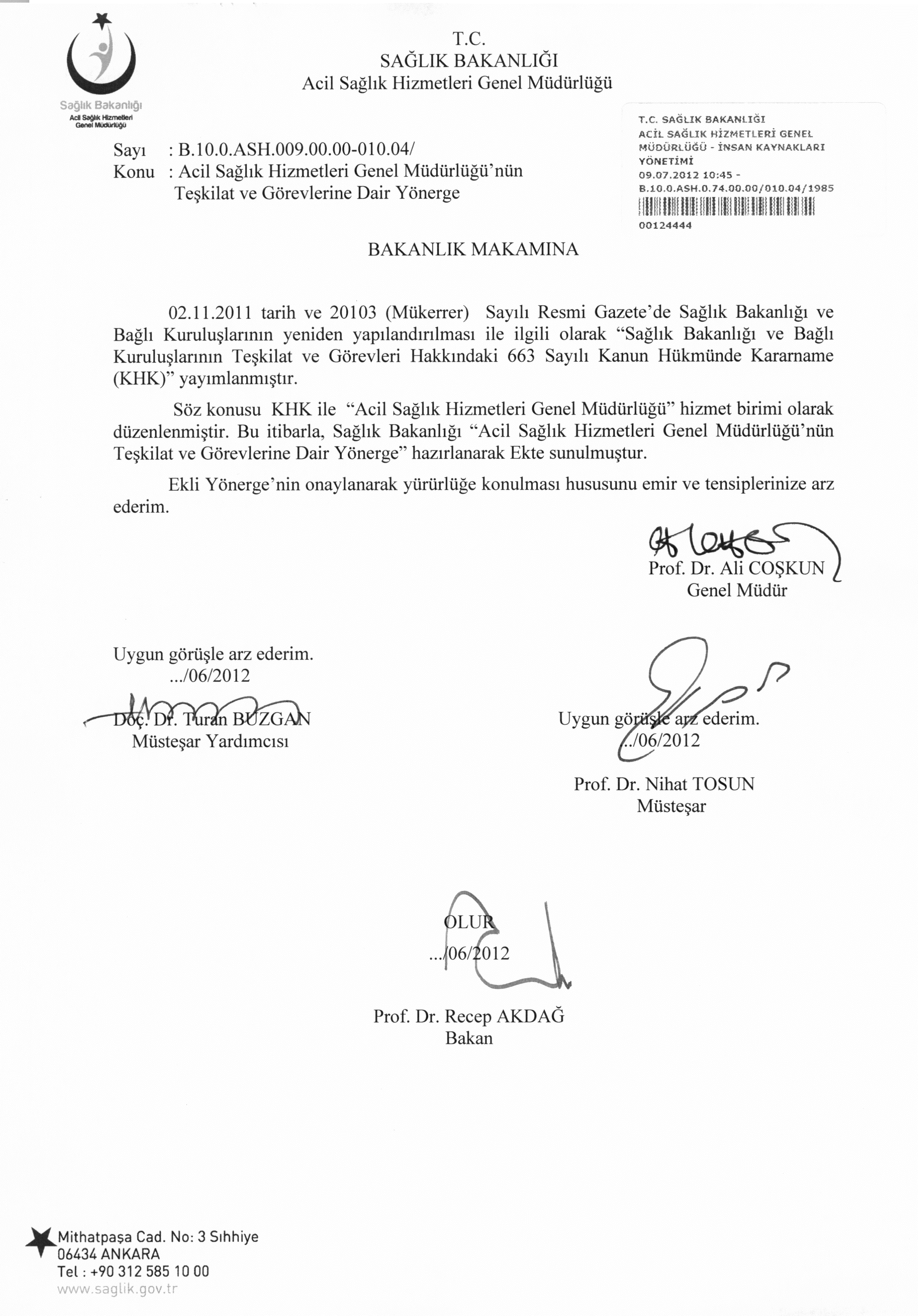 Sağlık Bakanlığı tarafından Acil Sağlık Hizmetleri Genel Müdürlüğü'nün Teşkilat ve Görevlerine Dair Yönerge yayımlanmıştır;