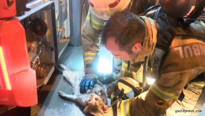 Öte yandan, sağlık ve itfaiye ekibinin kediye müdahalede bulunması cep telefonu kamerasına yansıdı.