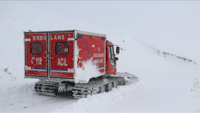 Yolun ulaşıma kapalı olan kısımlarında paletli ambulans kullanan ekipler, en kısa zamanda hastaya ulaşmak için kar, tipi, sis ve zorlu coğrafi şartlarla mücadele ediyor.