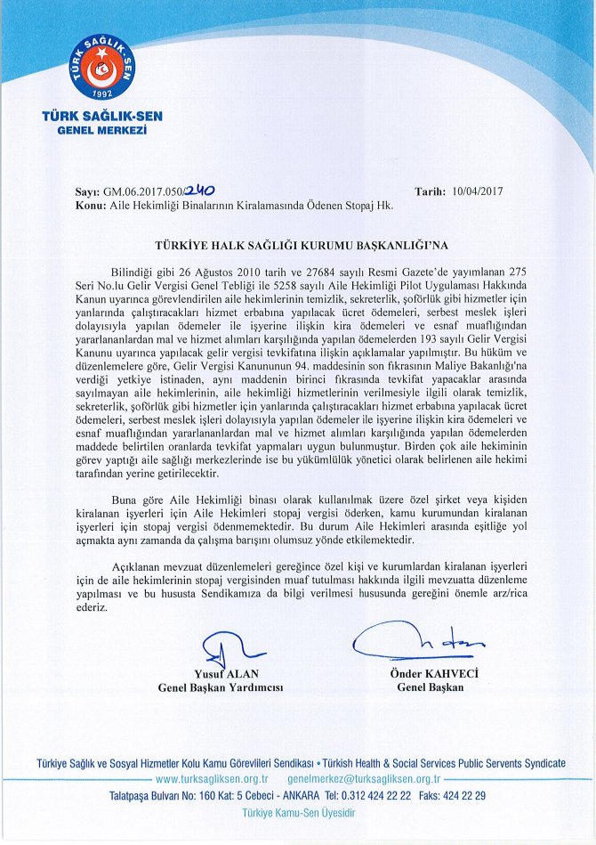 Özel kişi ve kurumlardan kiralanan işyerleri içinde aile hekimlerinin stopajdan muaf tutulması için ilgili mevzuatta düzenleme yapılması istendi.