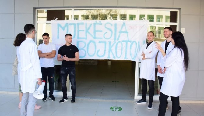 Tiran Tıp Fakültesinden onlarca öğrenci, başkent Tiran’daki Rahibe Teresa Üniversite Hastanesi ve Fakülte Dekanlığının önünde toplandı.