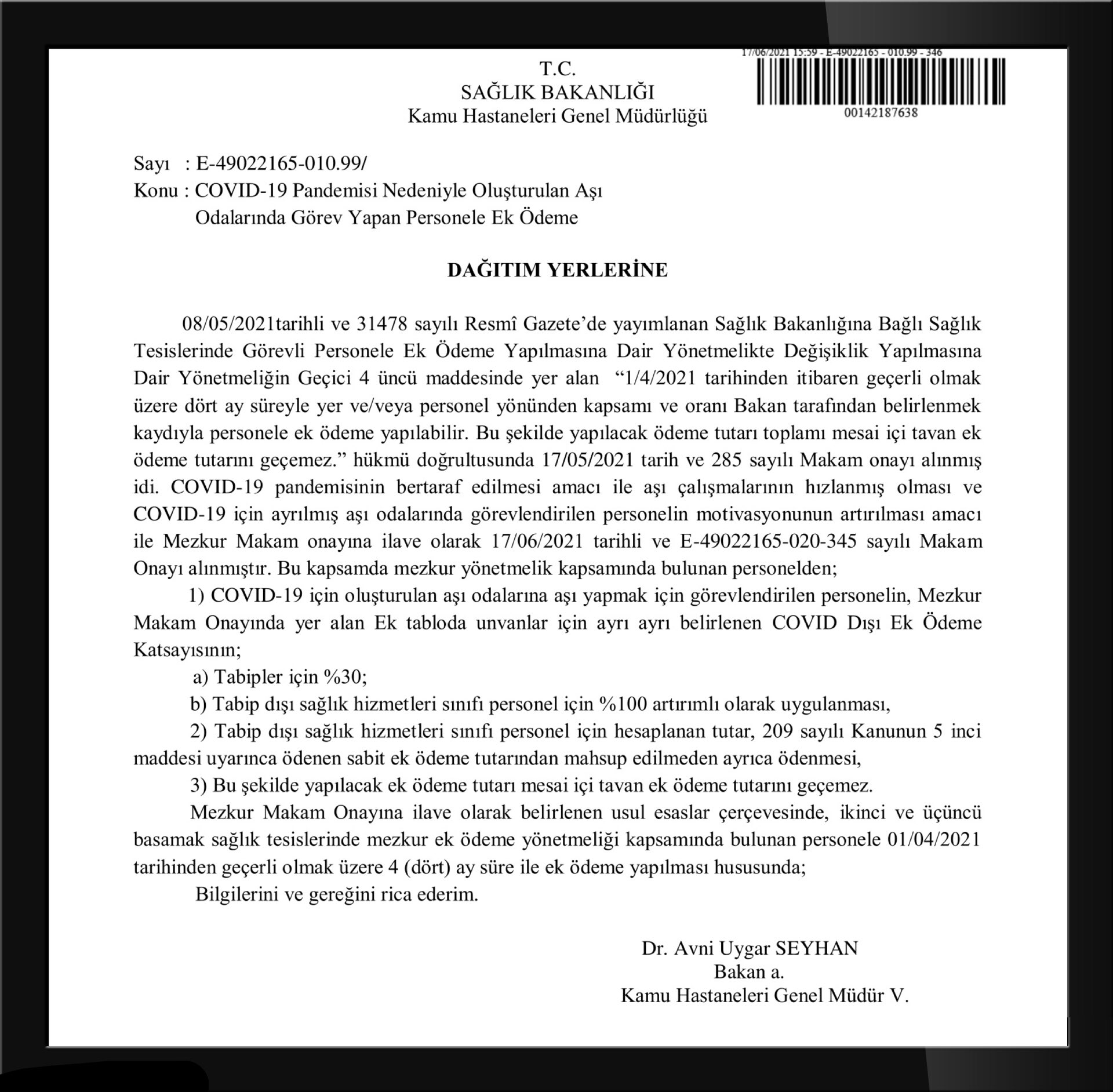 Konuyla ilgili sosyal medya hesabından paylaşım yapan Durmuş, “Yaptığımız görüşmeler neticesinde Sağlık Bakanlığı Kamu Hastaneleri Genel Müdürlüğü tarafından yayınlanan yazıyla birlikte hastanelerdeki aşı odalarında görev yapan sağlık çalışanları da 4 aylık ilave ek ödeme kapsamına alınmıştır” dedi.