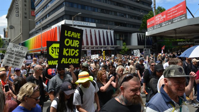 Melbourne’daki gösterilerde tasarıyı hazırlayan Victoria Başbakanı Daniel Andrews aleyhine sloganlar atan aşı karşıtları, Andrews’in görevden alınmasını isteyen pankartlar taşıdı.