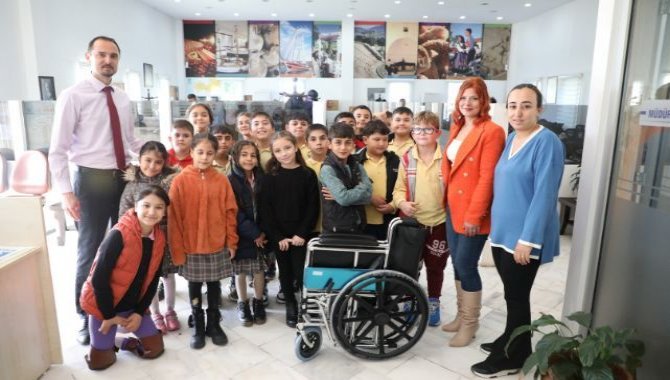 Öğrenciler tekerlekli sandalyeyi, Bodrum Belediyesi Kültür ve Sosyal İşler Müdürlüğüne ihtiyacı olan bir kişiye verilmek üzere teslim etti.