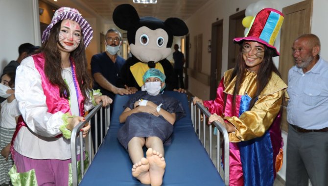 Balonlarla süslenen hastanenin girişinde palyaçolar tarafından karşılanan çocuklar işlemlerin ardından yine palyaçolar tarafından ameliyathaneye kadar götürülüyor.