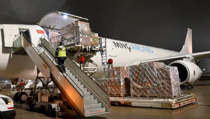 Binlerce Suriyelinin faydalanacağı, Travma Acil Cerrahi Kitleri ve temel ilaçları içeren 50 tonluk tıbbi malzemeyi taşıyan uçak saat 04.30'da "İnsani Hava Köprüsü" aracılığıyla İstanbul Havalimanı'na indi.