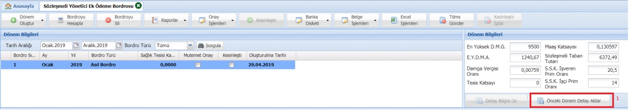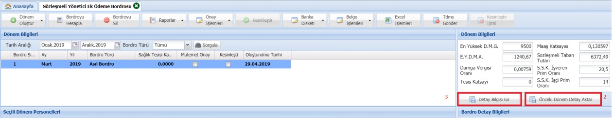Bordro oluşturma ekranında Sağlık Tesisi Katsayısı girilmeden dönem oluşturulması yönünde düzenleme yapılmıştır. Önce dönem oluşturulmalıdır. 01.04.2019 tarihinden itibaren Sağlık Tesisleri tarafından yapılacak bordrolarda aşağıdaki ekran görüntüsünde yer alan 2 numaralı alan (Önceki Dönem Detay Aktar) ve 3 numaralı alan (Detay Bilgisi Gir) eklenmiştir. 2 numaralı alan Nisan 2019 sonrası dönemlerde kullanılacak olup, Sağlık Tesisinin detay bilgilerinde herhangi bir değişiklik olmamışsa bu butondan önceki dönemde kullanılan detay bilgileri getirilecektir.