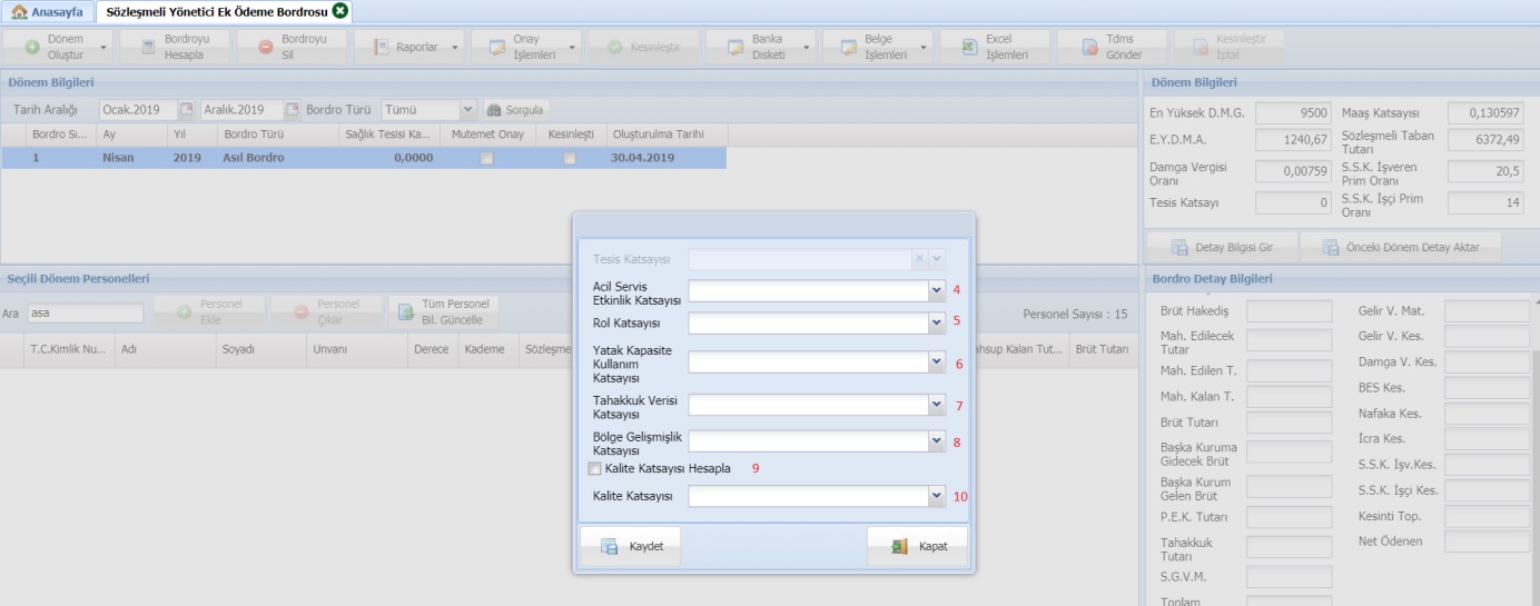 Veriler tamamlanıp kaydet butonu ile kaydedilecektir. Daha sonra bordro ekranında “Bordroyu Hesapla” butonuna basıldığında sistem önce Sağlık Tesisi katsayısını hesaplayacak, sonrasında bordro hesabını tamamlayacaktır.