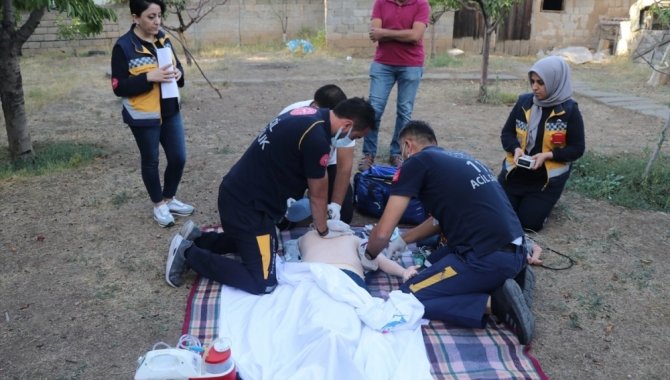 Senaryoya göre eğitmen tarafından verilen şikayetlere uygun tedavi uygulayıp tanı koymaya çalışan sağlıkçılar uzun bir süre kalp masajı yapıp, cansız mankenin hastaneye sevkini sağladılar.