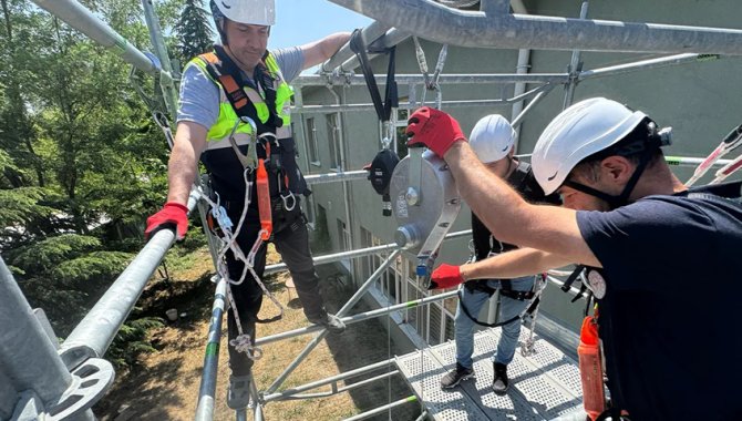 Eğitimde, yüksekte çalışmalarda alınması gereken iş sağlığı ve güvenliği önlemleri, kişisel koruyucu donanımların ve yüksekte çalışma ekipmanlarının doğru kullanımı ile kurtarma planlaması ve uygulamalarının ele alındı.