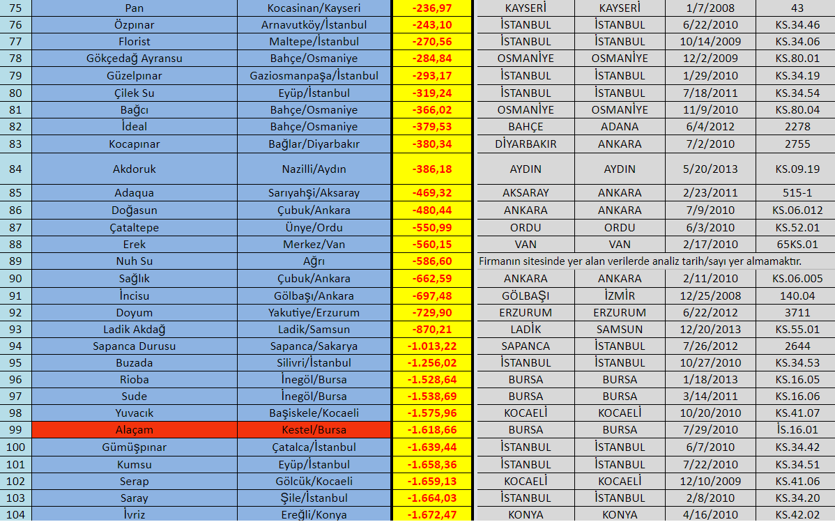Sularla ilgili hiçbir analiz yapmadıklarını ve/veya aracılık etmediklerini belirten Gıda Hareketi yetkilileri, Su numunesini alan da, analizleri yapan da Sağlık Bakanlığı'nın illerdeki ilgili birimleri olduğunu belirtiyor ve ekliyor: "Bu sadece bu resmi raporları bir araya getirerek tablolaştırıyoruz."
