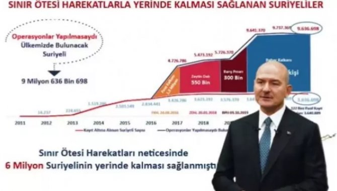 "Son 4,5 yılda yurt içindeki Suriyeli sayısı buradaki çocuk doğumlarına rağmen değişmediği ve artmadığı gibi aldığımız tedbirlerle göçe hazır 6 milyon insan, güvenli hale getirdiğimiz Suriye'nin kuzeyindeki bölgelerde kaldı"