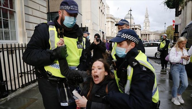 Başkent Londra'da Parlamento Meydanı'nda toplanan göstericiler, "Aşıya hayır, karantinaya hayır", "Çocuklarımızın üzerinden elinizi çekin", "Benim bedenim, benim kararım" yazılı pankartlar taşıyarak, hükümetin Kovid-19 tedbirlerini protesto etti.