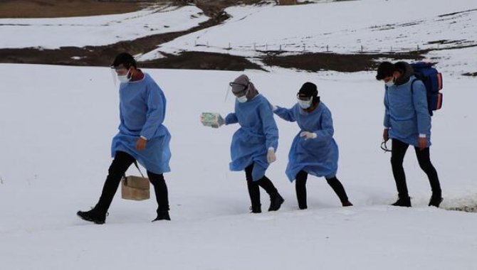 Kar, tipi ve soğuk havanın etkili olduğu bölgede araçların çıkamadığı yerlere zaman zaman yürüyerek gitmek zorunda kalan ekipler, ev ev, kapı kapı dolaşarak aşılarını yaptırmayanlara ulaşıyor.