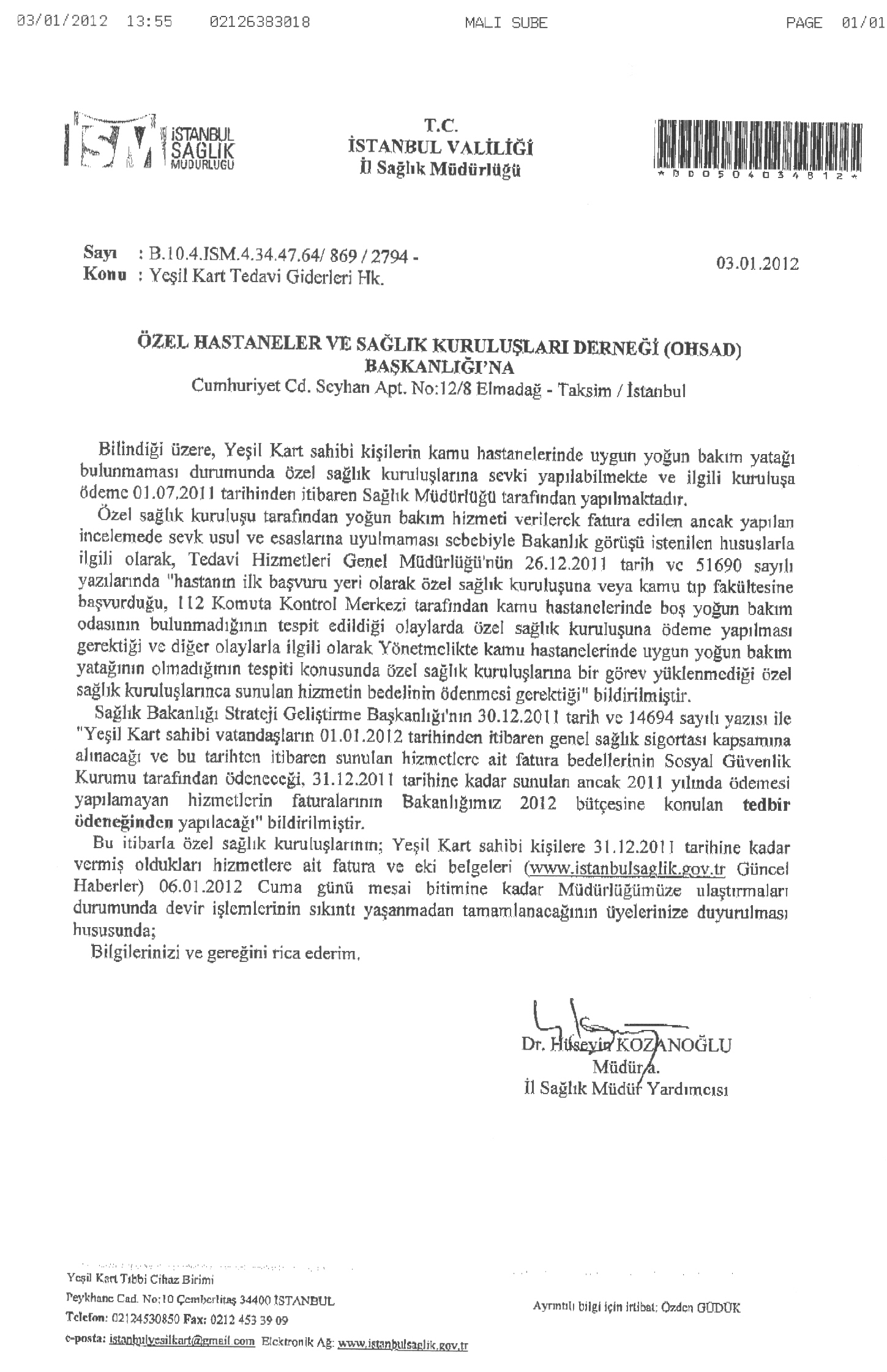 Bu itibarla özel sağlık kuruluşlarının; Yeşil Kart sahibi kişilere 31.12.2011 tarihine kadar vermiş oldukları hizmetlere ait fatura ve eki belgeleri www.istanbulsaglik.gov.tr Güncel Haberler) 06.01.2012 Cuma günü mesai bitimine kadar Müdürlüğümüze ulaştırmaları durumunda devir işlemlerinin sıkıntı yaşanmadan tamamlanacağının üyelerinize duyurulması hususunda;