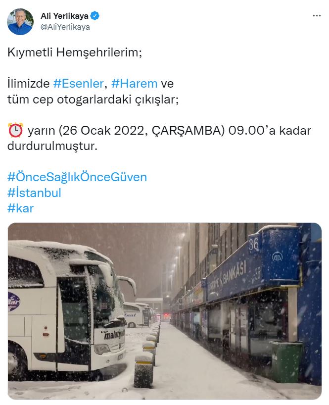 Vali Yerlikaya, sosyal medya hesabından yaptığı açıklamada, "Kıymetli hemşehrilerim. İlimizde Esenler, Harem ve tüm cep otogarlardaki çıkışlar, yarın 09.00'a kadar durdurulmuştur. Önce sağlık, önce güven." ifadelerini kullandı.