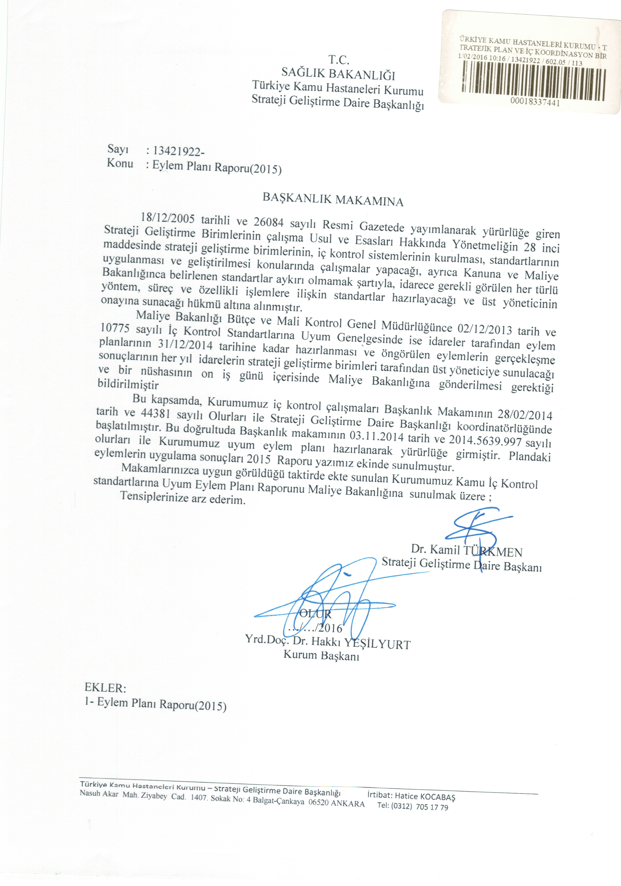 Bu kapsamda, Kurumumuz iç kontrol çalışmaları Başkanlık Makamının 28/02/2014 tarih ve 44381 sayılı Olurları ile Strateji Geliştirme Daire Başkanlığı koordinatörlüğünde başlatılmıştır. Bu doğrultuda Başkanlık makamının 03.11.2014 tarih ve 2014.5639.997 sayılı olurları ile Kurumumuz uyum eylem planı hazırlanarak yürürlüğe girmiştir. Plandaki eylemlerin uygulama sonuçları 2015 Raporu yazımız ekinde sunulmuştur.