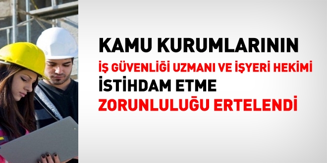 Yapılan düzenlemeye göre, tüm kamu kurumları açısından iş güvenliği uzmanı, işyeri hekimi istihdam etme zorunluluğu 1 Temmuz 2017'e ertelenmiştir.