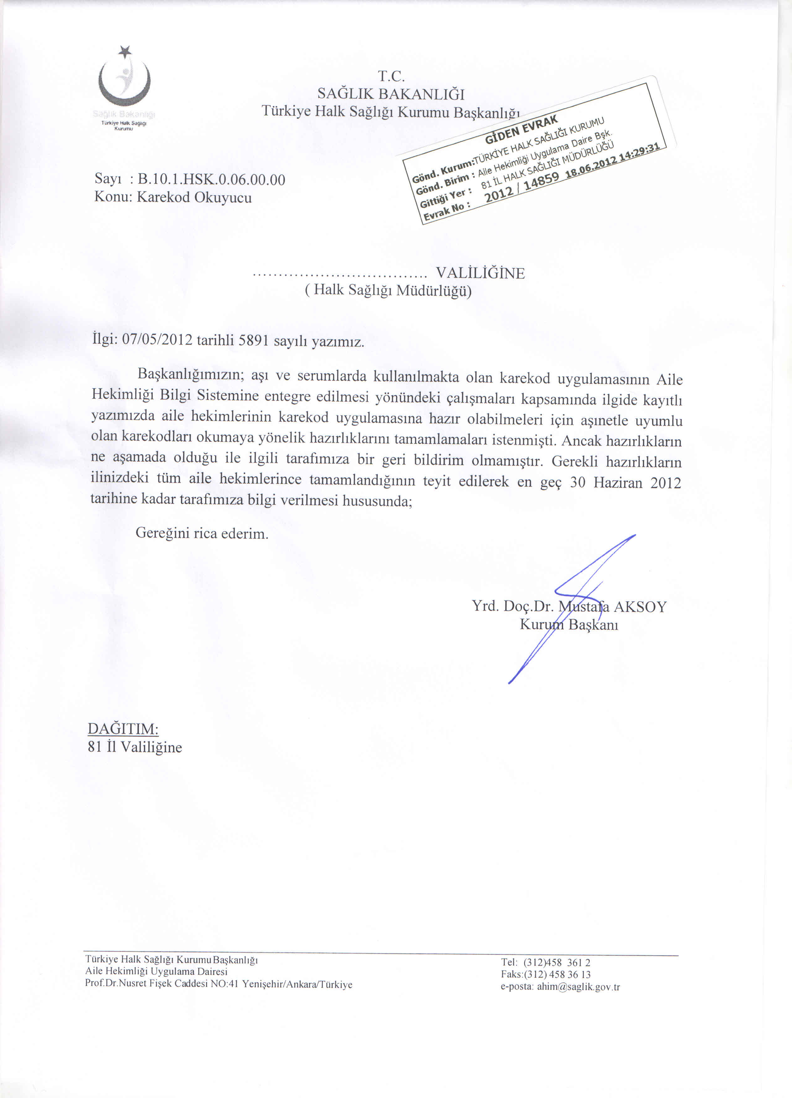 Başkanlığımızın; aşı ve serumlarda kullanılmakta olan karekod uygulamasının Aile Hekimliği Bilgi Sistemine entegre edilmesi yönündeki çalışmaları kapsamında ilgide kayıtlı yazımızda aile hekimlerinin karekod uygulamasına hazır olabilmeleri için aşınetle uyumlu olan karekodları okumaya yönelik hazırlıklarını tamamlamaları istenmişti. Ancak hazırlıkların ne aşamada olduğu ile ilgili tarafımıza bir geri bildirim olmamıştır. Gerekli hazırlıkların ilinizdeki tüm aile hekimlerince tamamlandığının teyit edilerek en geç 30 Haziran 2012 tarihine kadar tarafımıza bilgi verilmesi hususunda;
