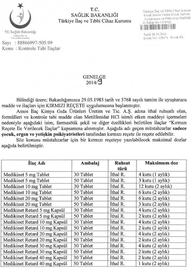 Sağlık Bakanlığı Türkiye İlaç ve Tıbbi Cihaz Kurumu tarafından "Kontrole Tabi İlaçlar" konulu 2014/9 sayılı genelge yayımlandı.