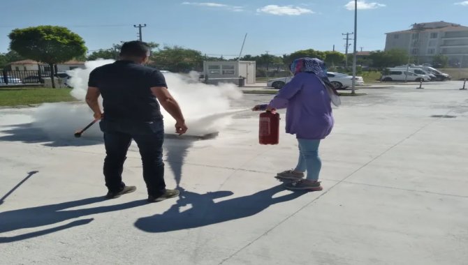 Tatbikatta, yangın ve afet anında yapılması gerekenler ve yangın tüpü kullanımı konusunda uygulama yapıldı.