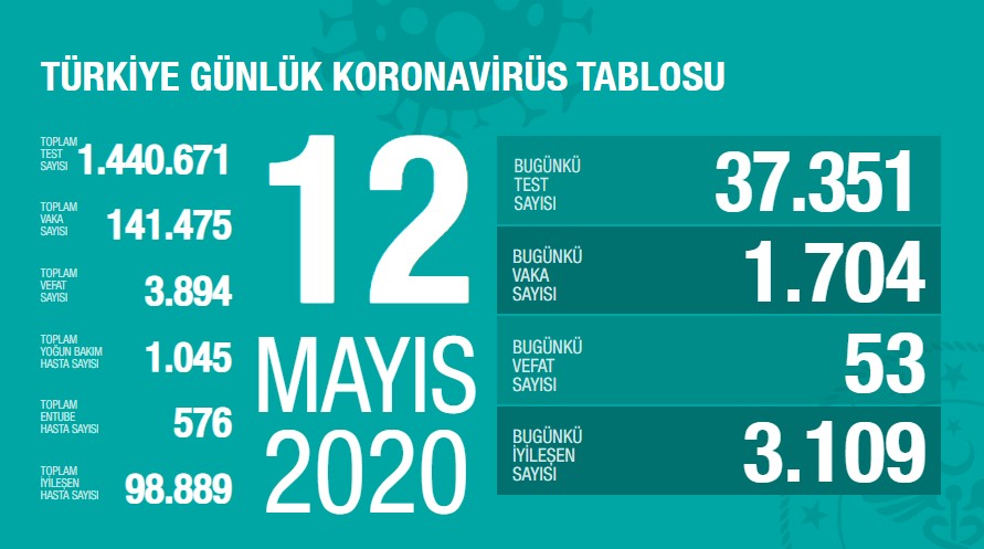 12 Mayıs: 141.475 vaka, 3.894 ölüm (53 ölüm, 1.704 tanı) - test sayısı 37.351 -Toplam test sayısı: 1.440.671