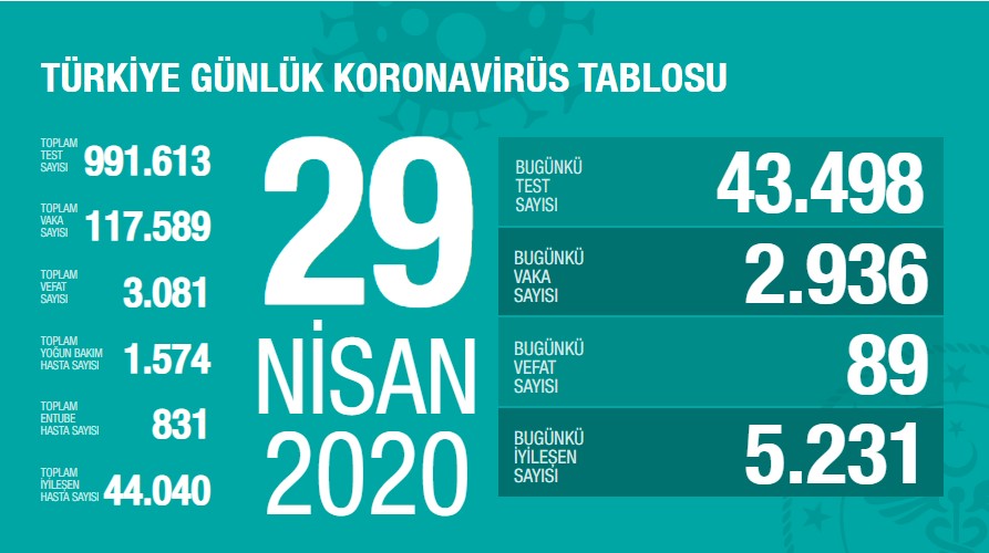 Tabloya göre, "Toplam test sayısı: 991 bin 613. Toplam vaka sayısı: 117 bin 589. Toplam vefat sayısı: 3.081. Toplam yoğun bakım hasta sayısı: 1.574. Toplam entübe hasta sayısı: 831. Toplam iyileşen hasta sayısı: 44.040. Bugünkü test sayısı: 43 bin 498 Bugünkü vaka sayısı: 2.936, Bugünkü vefat sayısı: 89, Bugünkü iyileşen sayısı: 5.231"