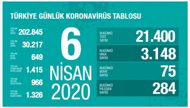 Tabloya göre, "Toplam test sayısı: 202 bin 845. Toplam vaka sayısı: 30 bin 217. Toplam vefat sayısı: 649. Toplam yoğun bakım hasta sayısı: 1415. Toplam entübe hasta sayısı: 966. Toplam iyileşen hasta sayısı: 1326. Bugünkü test sayısı: 21 bin 400 Bugünkü vaka sayısı: 3.148, Bugünkü vefat sayısı: 75."