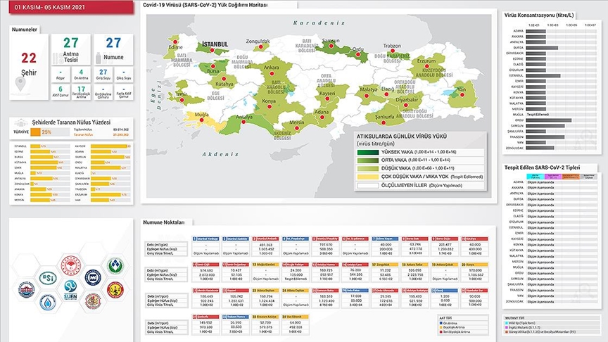 Tarım ve Orman Bakanlığına bağlı Türkiye Su Enstitüsü Başkanlığı (SUEN) koordinasyonunda yürütülen "Türkiye Genelinde Kovid-19 Yayılımının Atık Sularda SARS-CoV-2 Analizleri ile Takibi" projesi kapsamında, ülke genelinde 22 ildeki atık su tesislerinden alınan numuneler analiz edildikten sonra virüsün Türkiye'deki bölgesel yayılımı haritalandırılarak "covid19.tarimorman.gov.tr" adresinden yayımlanıyor.