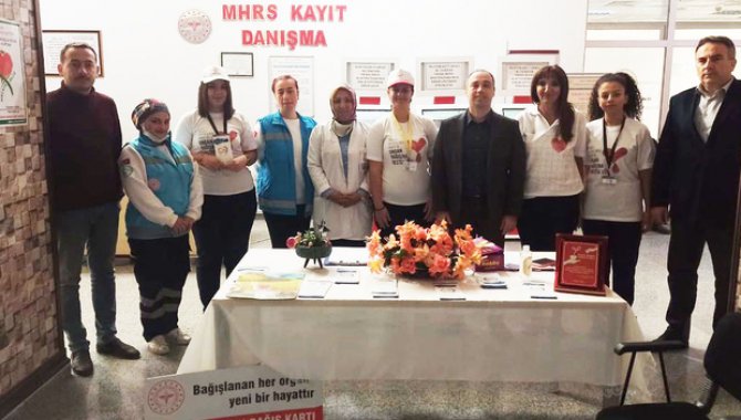 Hastane Başhekimi Dr. Selçuk Sezikli ile sağlık görevlileri, organ bağışına dikkati çekmek amacıyla hastane girişinde etkinlik düzenledi.