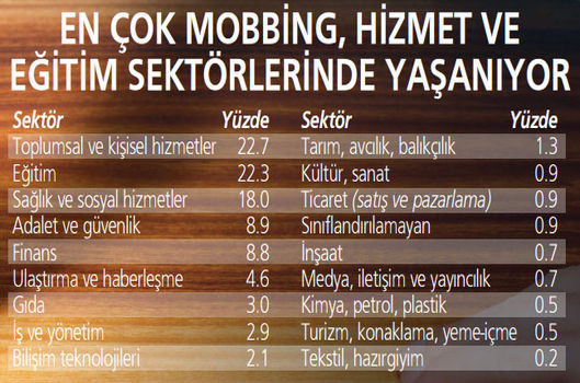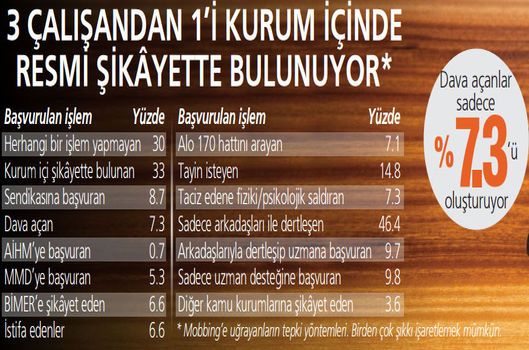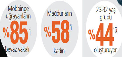 İşyerinde psikolojik şiddet, taciz ve rahatsız etme anlamına gelen mobbing ile ilgili farkındalık yavaş yavaş artsa da rakamlar henüz mobbing ile nasıl mücadele edileceğinin bilinmediğini ortaya koyuyor. Mobbing ile Mücadele Derneği'nin verilerine göre,işyerinde mobbinge uğrayan Türklerin yüzde 6.6'sı istifa ederken, yüzde 14.8'i tayinini istiyor. Yani mobbinge uğrayan 5 kişiden 1'i kaçmayı tercih ediyor. Çalıştığı kuruma şikayet edenlerin oranı sadece yüzde 33. Herhangi bir işlem başlatmayanların oranı ise yüzde 30. Mobbinge uğrayan çalışanların en sık uyguladığı yöntem arkadaşlarıyla dertleşmek. Mağdurların yüzde 46.4'ü bu yönteme başvururken, dava açanların oranı yalnızca yüzde 7.3. Mobbinge uğrayanların yüzde 87'si işyerinde başkalarının da mobbinge uğradığına tanık olduğunu söylüyor. Mobbinge uğrayanların yüzde 58'i kadın. En çok mobbinge maruz kalınan yaşlar ise 23 ile 32 yaş aralığı. Bu yaş grubuna denk gelenler toplamın yüzde 44'ünden fazlasını oluşturuyor. Bir başka deyişle, işe ilk girilen yıllar en çok psikolojik baskıya maruz kalınan yıllar olarak öne çıkıyor.