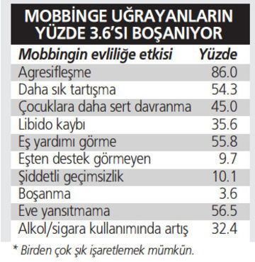 Mobbinge uğrayanların yüzde 50'den fazlası evli. Evli olanlara mobbingin özel hayatlarını nasıl etkilediği sorulduğunda evliliklerin ciddi hasar gördüğü ortaya çıkıyor. Kişilerin yüzde 56.5'i, mobbinge uğradığını açıktan eve yansıtmamaya çalıştığını söylüyor. Ancak sonuçları bunun başarılı olmadığını ortaya koyuyor. Mobbinge uğrayanların yüzde 86'sı agresifleştiğini kaydederken, yüzde 54.3 gibi önemli bir kısım daha sık tartışma yaşandığını belirtiyor. 3 kişiden 1'i mobbinge bağlı cinsel isteksizlik ve libido kaybı yaşadığını dile getirirken, çocuklara daha sert davranma eğilimine girdiklerini ifade edenlerin oranı yüzde 45. Ayrıca, alkol ve sigara kullanımında artış yaşadığını söyleyenlerin oranı da yüzde 32.4.