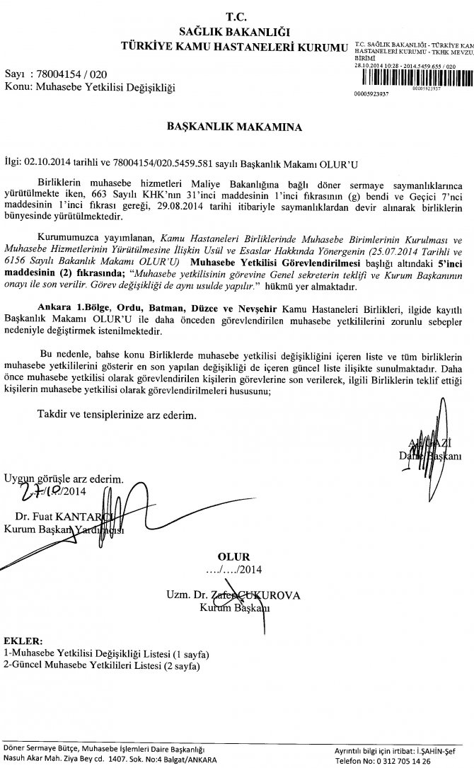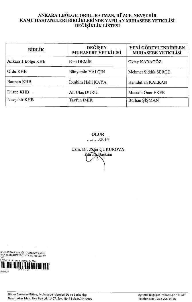Sağlık Bakanlığı Türkiye Kamu Hastaneleri Kurumu tarafından 28.10.2014 tarihli 'Muhasebe Yetkilisi Değişikliği Makam Olur'u yayımlandı.