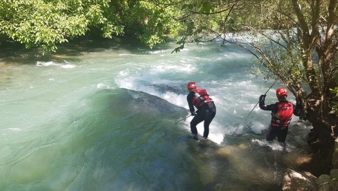 Kayalık ve ağaçlık alanları kontrol eden ekipler, çayda halat bağlanan rafting botlarıyla arama faaliyetini gerçekleştiriyor.
