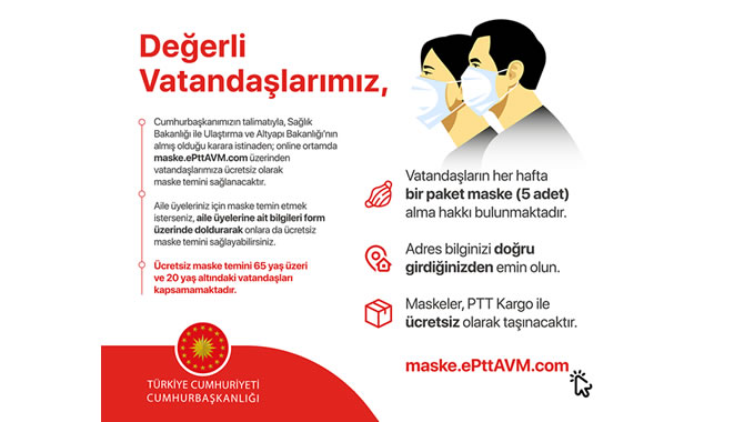 T.C. Sağlık Bakanlığı ile T.C. Ulaştırma ve Altyapı Bakanlığı'nın almış olduğu karara istinaden; online ortamda ePttAVM.com üzerinden vatandaşlarımıza ücretsiz olarak maske temini sağlanacaktır.