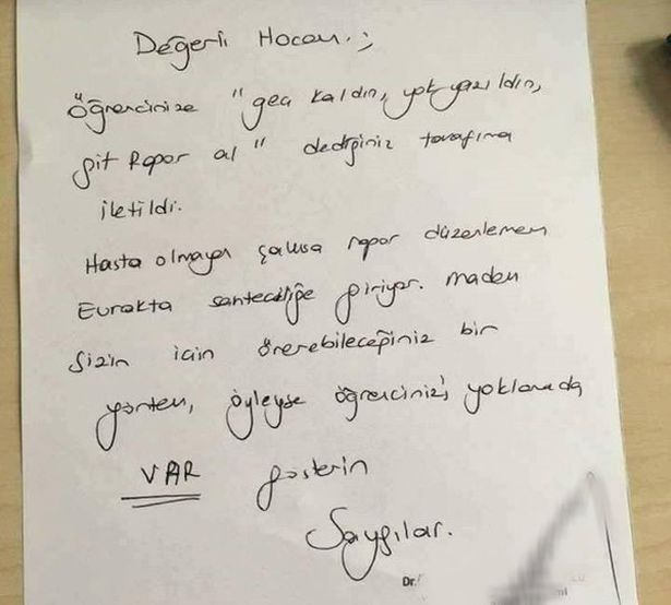 Derse geç kaldığı için "yok" yazılan öğrenciden öğretmeni sağlık raporu istedi. Rapor talep edilen doktor tarafından öğretmene cevap yazıldı. İlginç cevap sosyal medyada kısa sürede yayıldı. Hem öğrenciler ve hem de sağlık camiası tarafından beğenilen cevap paylaşım rekorları kırıyor. Cevapta, "Değerli hocam; öğrencinize "geç kaldın, yok yazıldın, git rapor al" dediğiniz tarafıma iletildi. Hasta olmayan sahsa rapor düzenlemem evrakta sahteciliğe giriyor. Öyleyse yoklamada öğrencinizi var gösterin. Saygılar…" denildi.