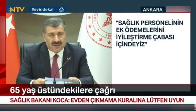 Sağlık Bakanı Fahrettin Koca, koronavirüs salgını ile gece gündüz mücadele eden sağlık personelinin ek ödemelerini iyileştirme çabası içinde olduklarını belirterek, "Sağlık çalışanlarına yüzde yüz oranında ek ödemeler olacak" dedi.