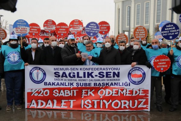 Bakanlık önünde Sağlık-Sen Bakanlık Şube Başkanı Tahir Eren tarafından yapılan açıklamada; Bakanlık merkez teşkilatı, Türkiye Hudut ve Sahiller Sağlık Genel Müdürlüğü, Türkiye İlaç ve Tıbbi Cihaz Kurumu’nda (TİTCK) görev yapanlar ile araştırmacı unvanlı sağlık çalışanlarının da sabit ek ödemelere yapılan yüzde 20 artıştan yararlanması talep edildi. Eren, Bakanlığın sağlık çalışanlarının sorunlarını görmezden geldiği vurgulandı.