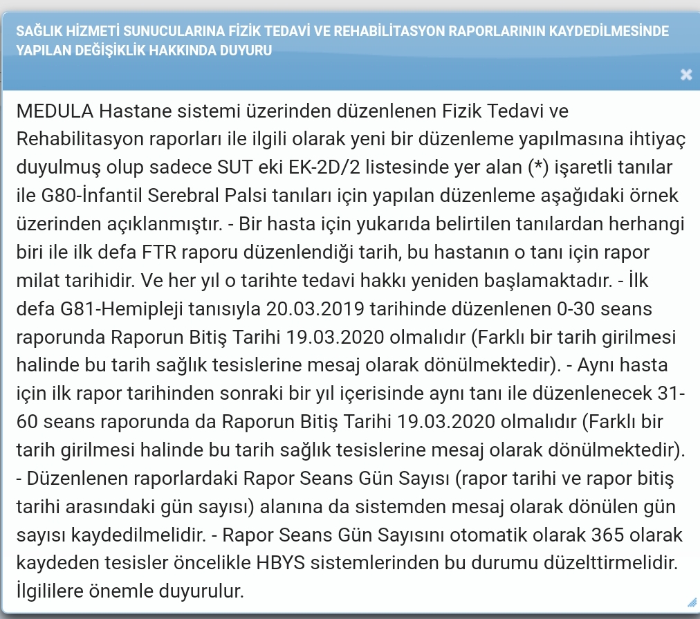 - Aynı hasta için ilk rapor tarihinden sonraki bir yıl içerisinde aynı tanı ile düzenlenecek 31 - 60 seans raporunda da Raporun Bitiş Tarihi 19.03.2020 olmalıdır (Farklı bir tarih girilmesi halinde bu tarih sağlık tesislerine mesaj olarak dönülmektedir).