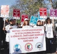Sağlık ve Sosyal Hizmet Emekçileri Sendikası (SES) üyesi bir grup, Hacettepe Üniversitesi’nde (HÜ) banka promosyonları ile ilgili oluşturulan komisyonca alınan kararların uygulanmadığı ve taleplerinin yerine getirilmediği gerekçesiyle eylem yaptı. DİSK’e bağlı Dev Sağlık- İş, SES ve TTB üyelerinin, hastanelerin özelleştirilmesi ve işten çıkarmalara karşı İstanbul’dan başlattığı yürüyüş ise yarın Ankara’da son bulacak.