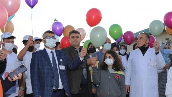 Üzerinde kalp ile börek gibi organ resimleri bulunan ve "Organlarınızı bağışlayın" yazılı tişört ile şapka giyen sağlık meslek lisesi öğrencileri ile hastane yöneticileri ve sağlıkçıların çocukları, "Her bağış bir hayattır" sloganıyla hastane bahçesinde dilek fenerleri ve rengarenk balonları gökyüzüne bıraktı.