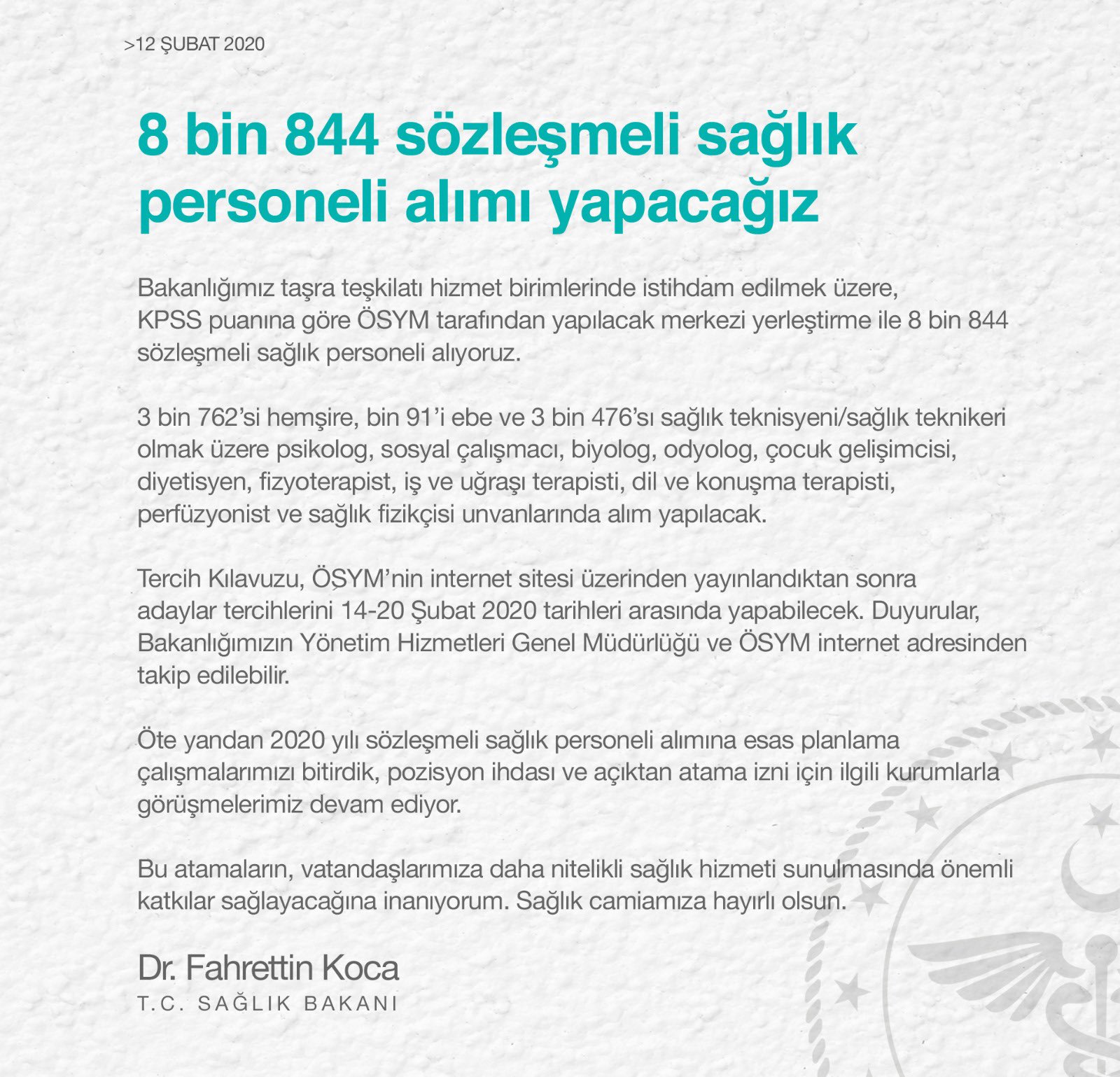 Açıklamada, "Bakanlığın taşra teşkilatı hizmet birimlerinde istihdam edilmek üzere, KPSS puanına göre ÖSYM tarafından yapılacak merkezi yerleştirme ile 8 bin 844 sözleşmeli sağlık personeli alıyoruz." bilgisini veren Koca, şunları kaydetti: